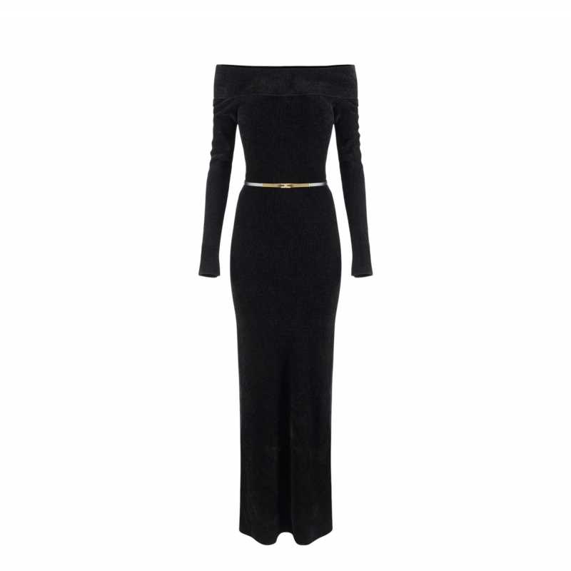 Robe longue AM34S 110 – Velours noir col bateau – Elisabetta Franchi Femme