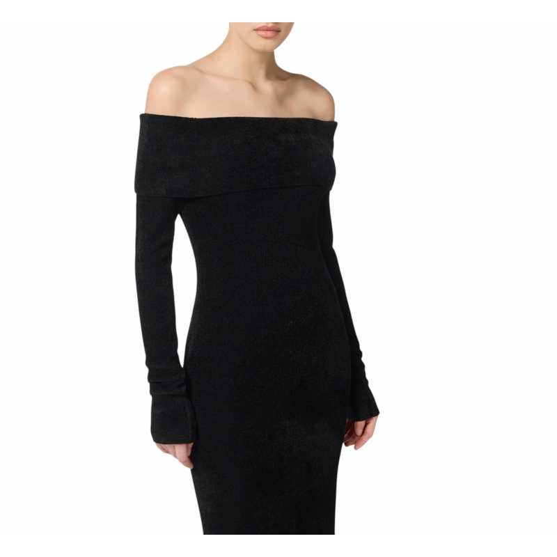 Abito lungo nero effetto velluto con maniche lunghe e scollo a barchetta del marchio Elisabetta Franchi per donna rif. AM34S 110
