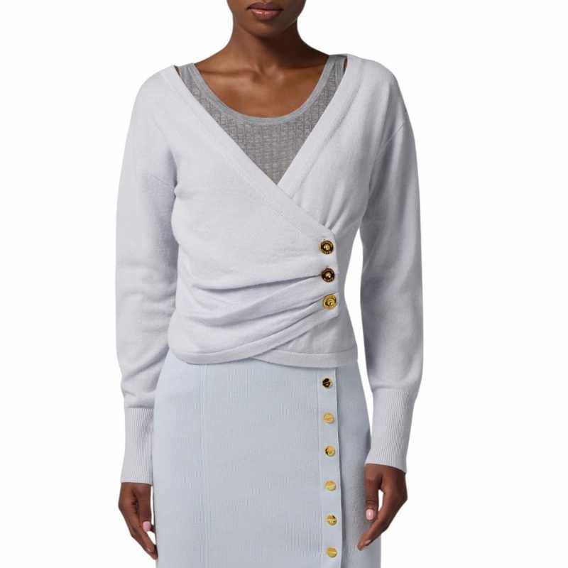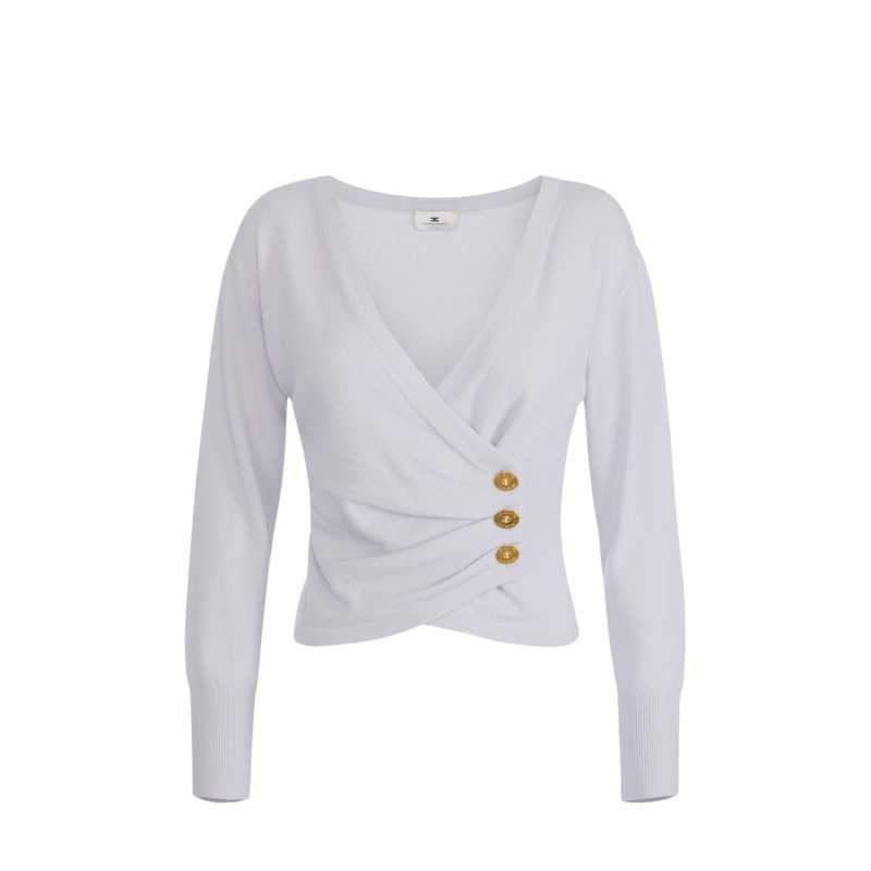 pull cache-cœur Elisabetta Franchi femme, pull en cachemire gris, pull boutons dorés chic, pull italien luxe femme, maille élégante femme.