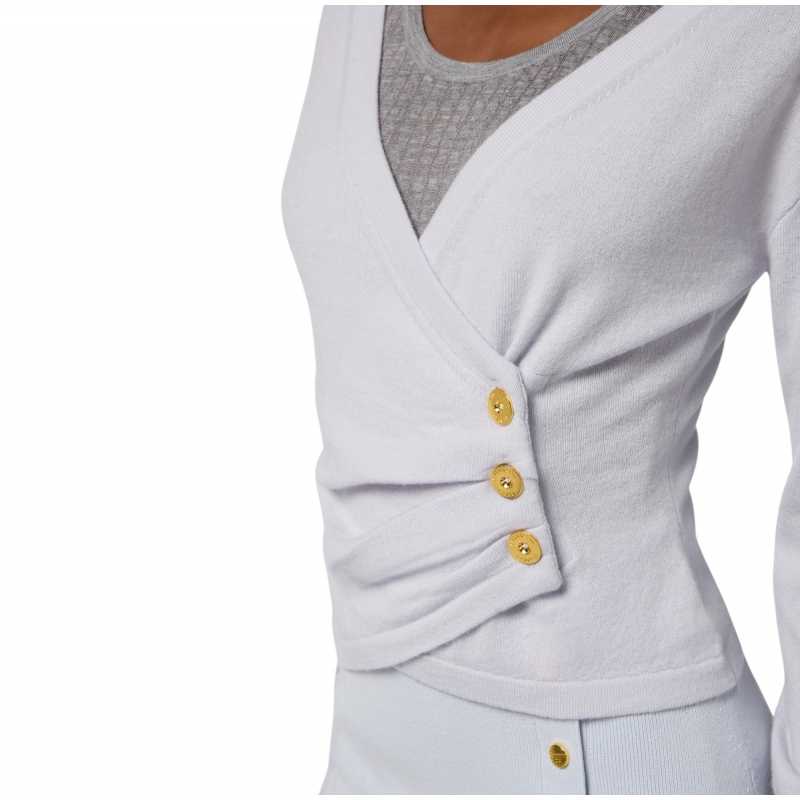 Pull en cachemire mélangé à la coupe classique, avec une trame douce qui caresse votre peau, se caractérisant par un décolleté en V croisé ainsi que des des manches longues. Il propose des boutons en métal doré placé sur un côté, qui rehaussent le drapé central.