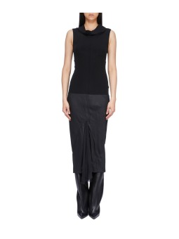 Dotée de manches longues, cette robe élance la silhouette tout en restant parfaitement adaptée aux superpositions chères à l’univers Rick Owens. À l’arrière, une fente discrète mais audacieuse assure une démarche fluide, féminine et confortable.
