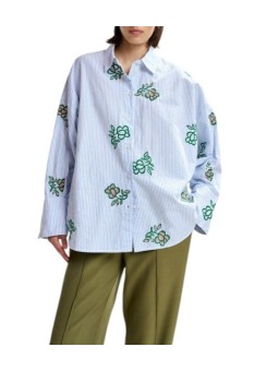 Chemise rayé de couleur blanc bleu broderies fleurs vertes en sequins Jalinki J1CO Essentiel Antwerp pour femme.